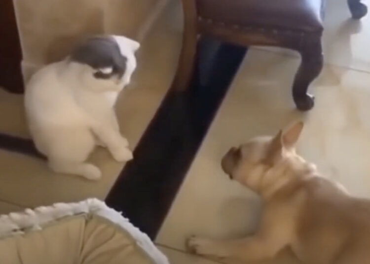 猫さんと睨み合っている犬さん。