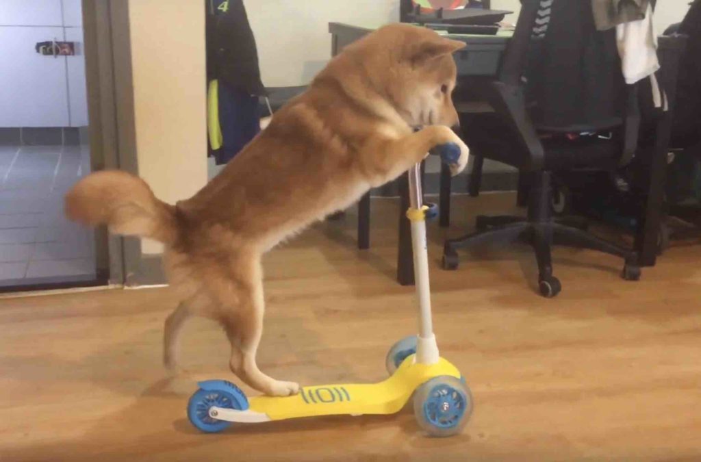 お部屋でキックボードに乗って、片足でちょんちょんと