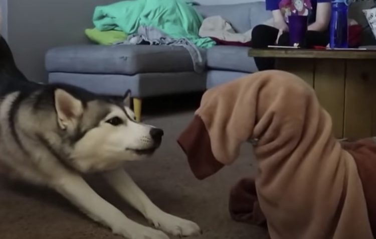 パジャマから抜けられないの?友達犬を助けてあげるハスキー。