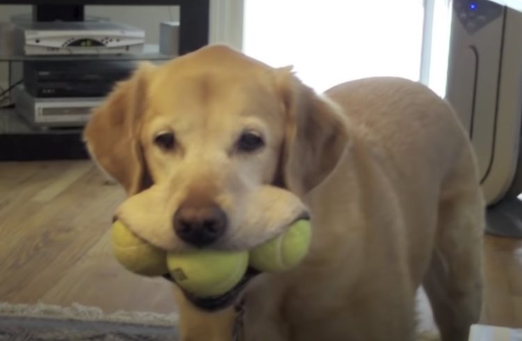 ちょ、欲張りすぎ!3個もまとめてボールを持って来る犬。