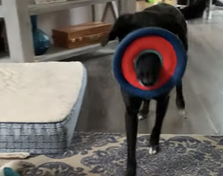 前が見えない~!フリスビーの持ち方が変なワンコ。