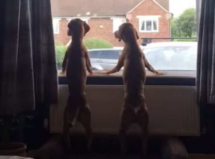 窓際に立ってソワソワしている2匹の犬さん。