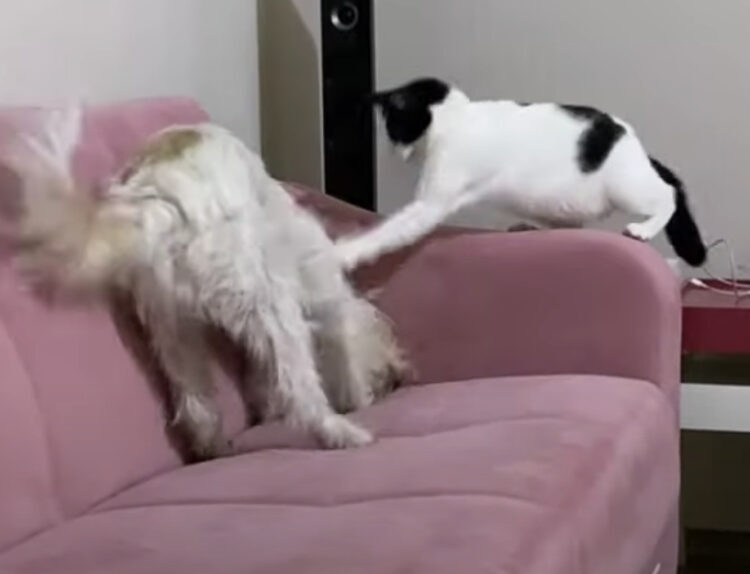 「ソファ掘ったらダメ!」猫に怒られちゃう犬。でも手が止められない!