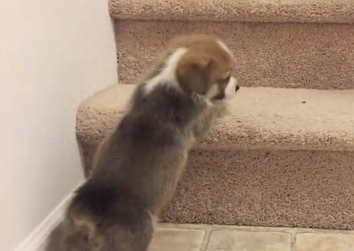 飼い主さんがしているように、自分も登ろうとチャレンジしますが…