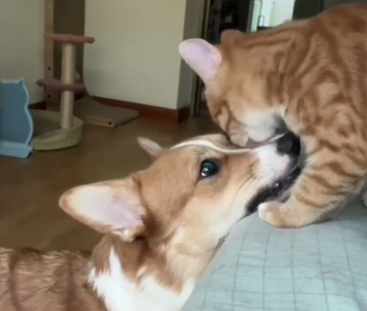 猫さんに毛繕いしてもらって喜んでいるのかと思ったら、