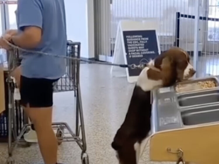 「誰も見てないし♪」ご主人の背後で堂々と盗み食いするワンコ。