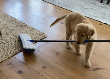 飼い主さんの真似っ子をするように床そうじ♪