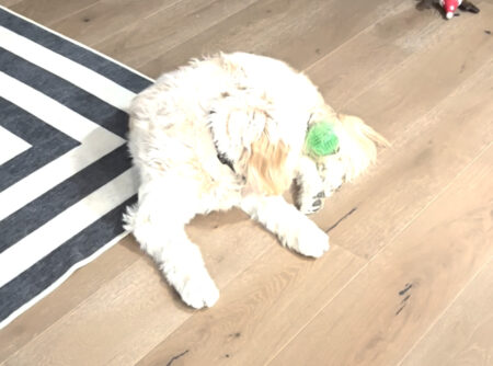 自慢のモフモフの毛にボールがくっついて