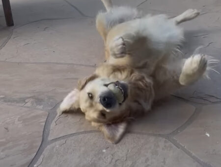 仰向けになった犬さんが
