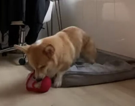 その後ろでひとり遊んでいるコーギー犬さん。