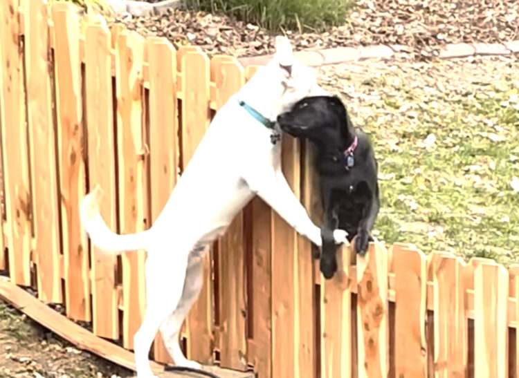 尻尾を振りながらフェンス越しに仲良くしている姿に