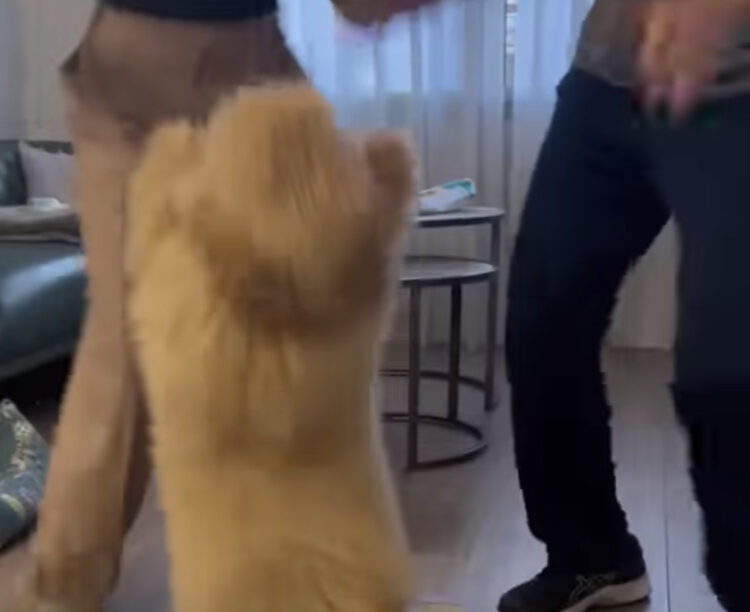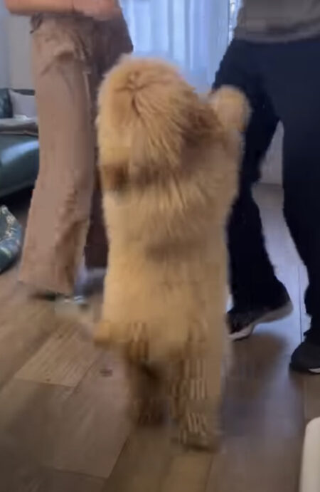 両手をわ〜いっ♪と挙げてダンスを楽しむ犬さん。