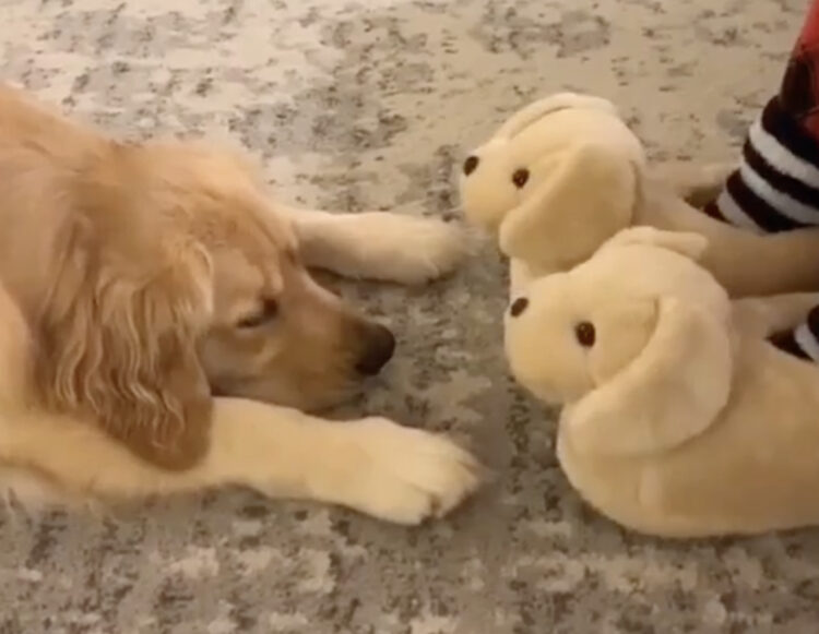 2匹もライバルが増えた…スリッパを見て不機嫌になる犬さん。