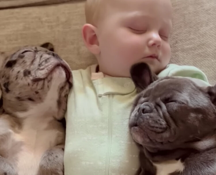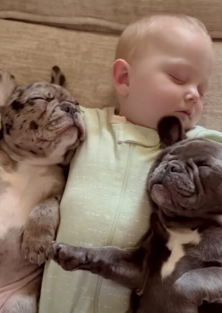 しあわせそう♪ 両腕に子犬を抱えて眠る赤ちゃん。