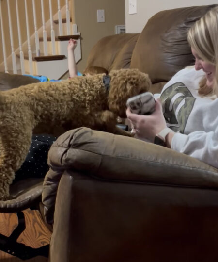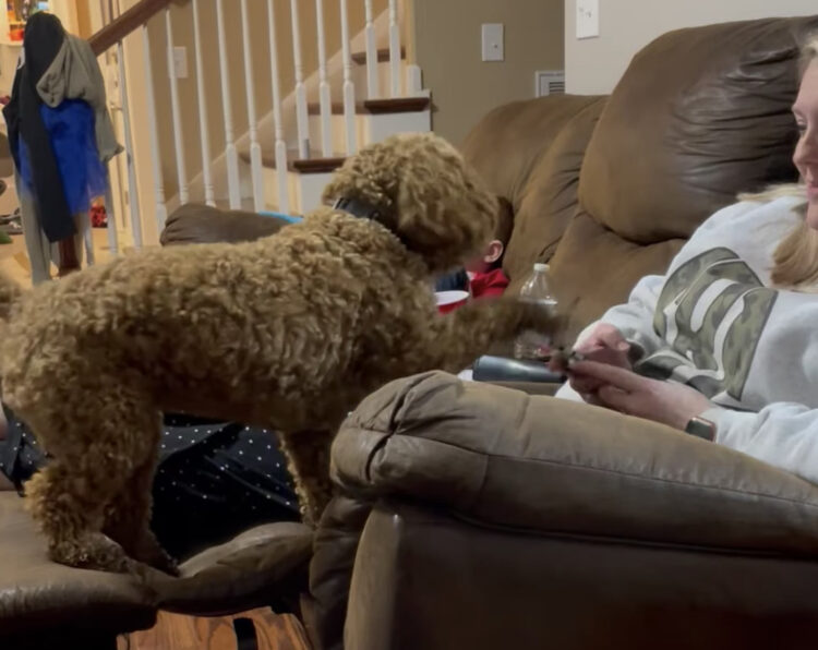 こちらの犬さんは、女性がスマホを持っていると