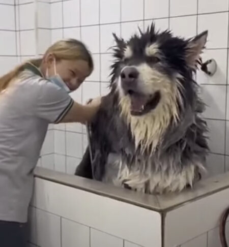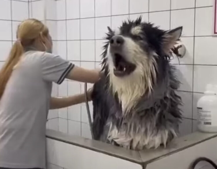 体を洗ってもらっているハスキーさん。