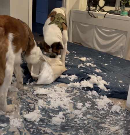 あ〜あ、やっちゃった〜。 セントバーナード、豪快に枕を破壊!