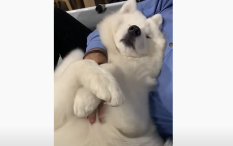 飼い主さんの腕をぎゅ〜! 甘えん坊なサモエド犬。