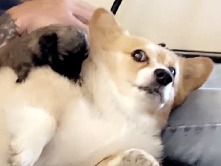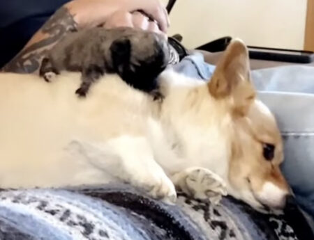ふと気がつくとコーギーさんの背中に…