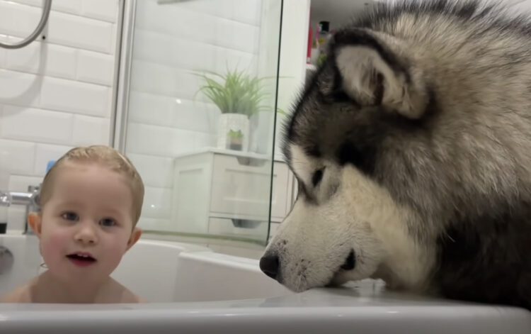 バスタブの近くで見守りをしてくれているのです♪