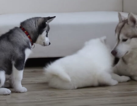ほっこり癒される。サモエド子犬とハスキーのふわもこコラボ!