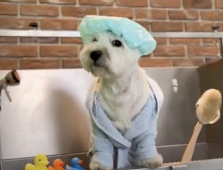 お風呂に入る気満々の犬さん!