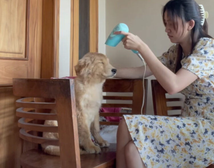飼い主さんにドライヤーで体を乾かしてもらっていると