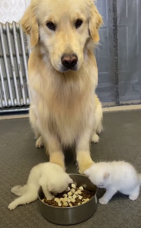 二匹の子猫と一緒に暮らしているゴールデンレトリバーさん。