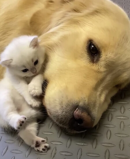 子猫たちを見つめる犬さんの目が本当に優しくて