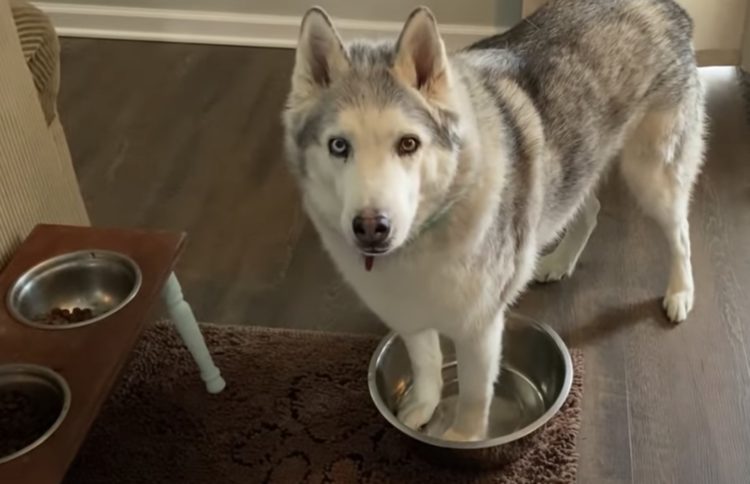 ボウルに入っていたお水を飲みたかったハスキー犬さん。