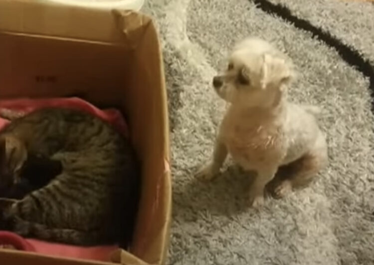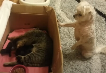 本当は興味津々だけど、吠えたりせずに母猫を気遣って