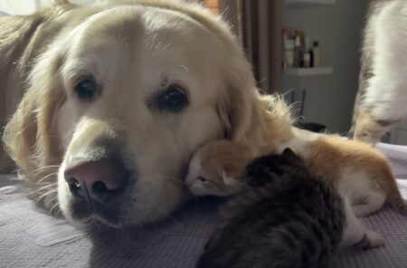 子猫達に「この犬さんは怖くないんだよ〜」と
