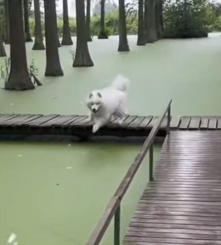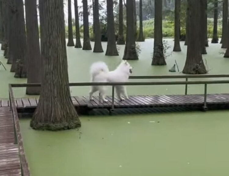 緑色の水面をを芝生だと勘違いした犬さんが