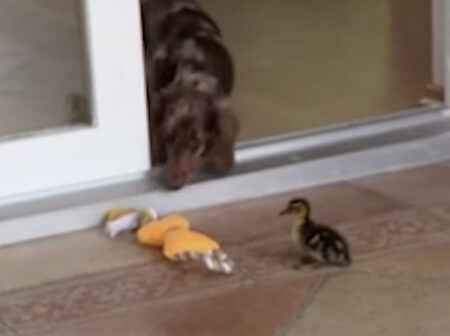 犬「何この小っちゃいの〜!」 アヒルの子にタジタジ!