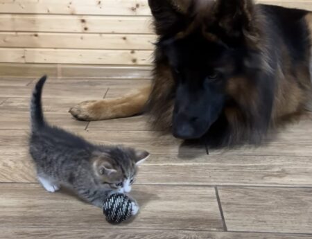 ボールを転がしながら子猫さんがやってきます。