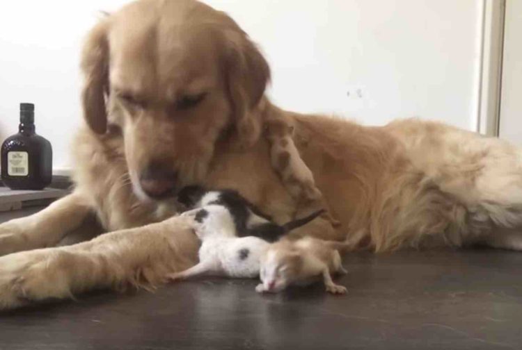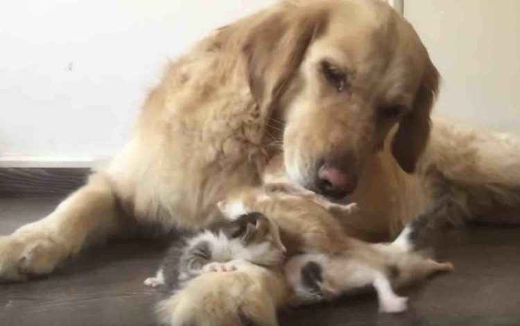優しさでほっこり。野良の子猫をお世話するゴールデンレトリバー。