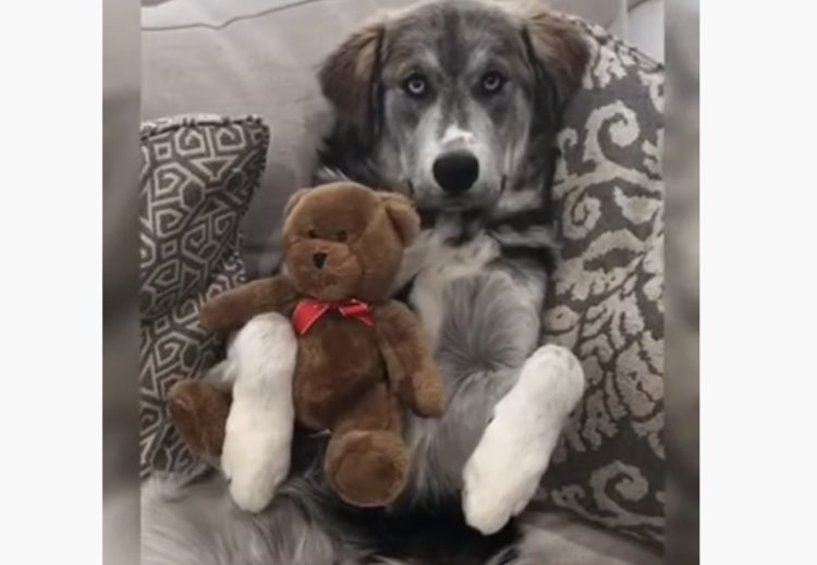 クマのぬいぐるみを抱えてソファにくつろいでいるワンコさん。