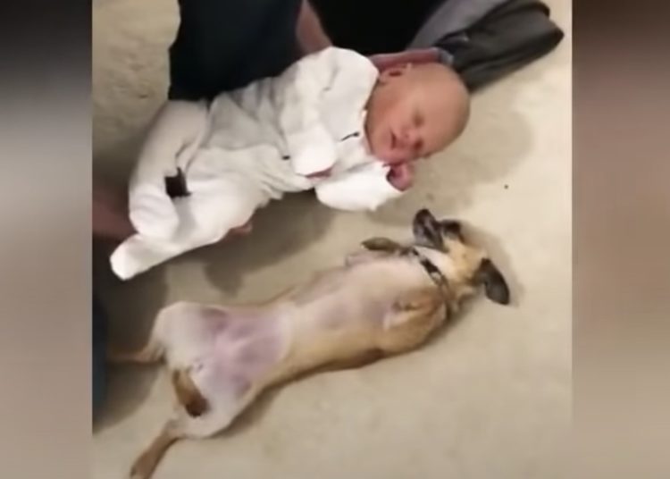 赤ちゃんとの初めての対面!大喜びの犬が同じポーズでお出迎え。