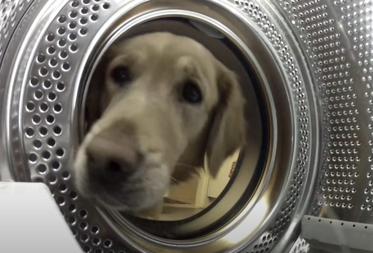 「今助けるぞ〜!」大事なぬいぐるみを洗濯機から救出しようとする犬さん。
