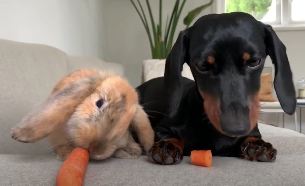 誰かと一緒に食事するって楽しい!仲良しな犬&ウサギ