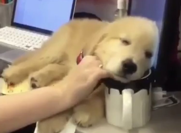 起こさないようにそーっと…変な場所で寝ちゃう子犬。