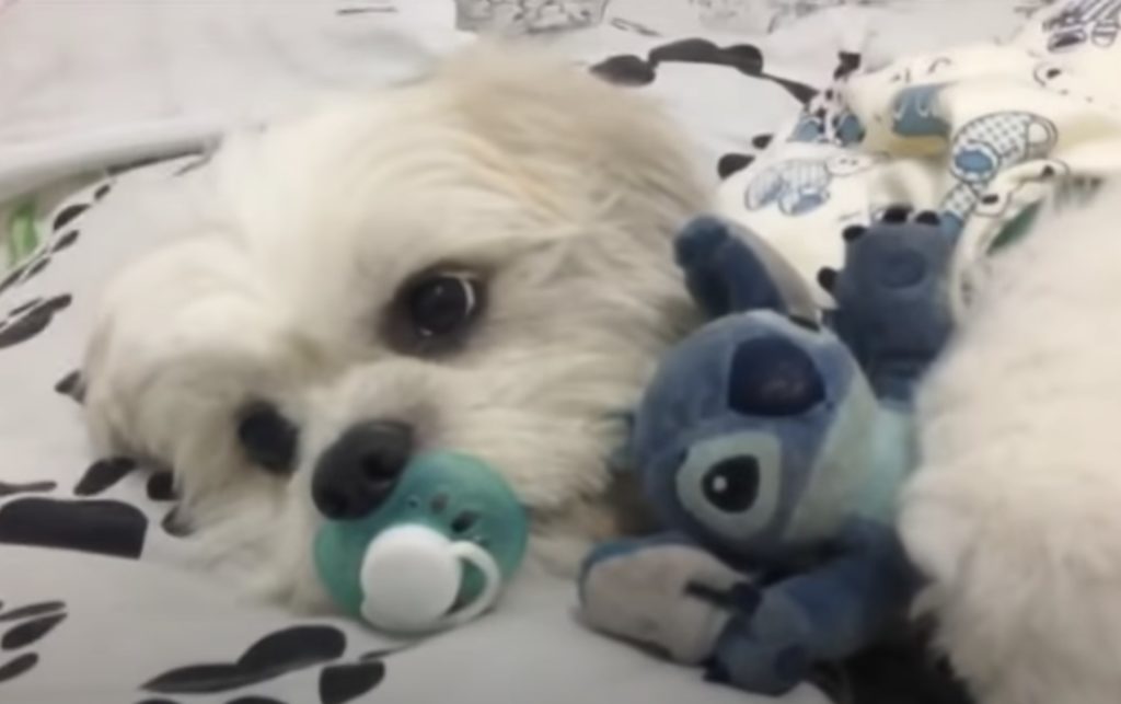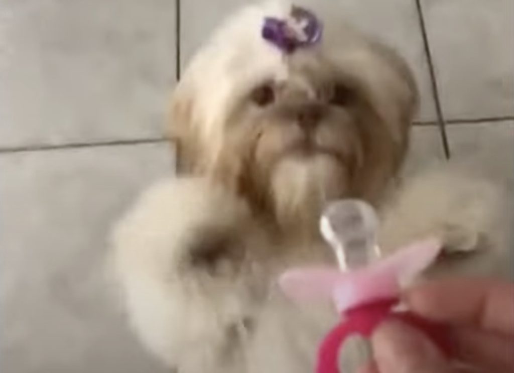 赤ちゃんになってる…。おしゃぶりを気に入った犬さん。