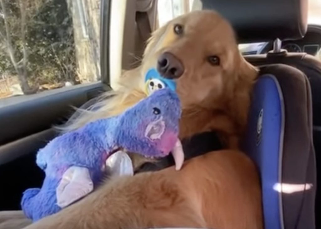 飼い主さんと車でお出かけ中の 体の大きなゴールデンレトリバーさん。 ちゃんとひとりでシートに座って おとなしくしてくれています。 よく見ると犬さんの口には おしゃぶりをくわえて、 腕の中には大好きなぬいぐるみ。 そしてお気に入りの毛布に包まれて... -