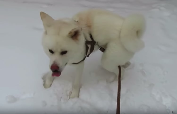 のんびりなんて歩いてられない!雪にはしゃぐ秋田犬。
