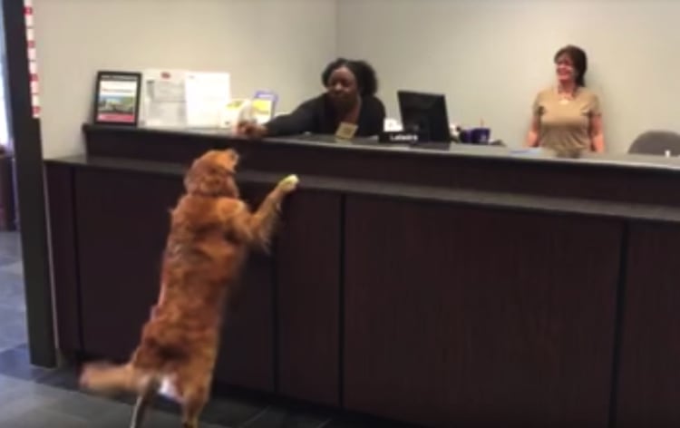 カウンターに遊びに来た様子のゴールデンレトリバーさん スタッフの女性が持っているおやつが欲しくって 右へ左へ必死に追いかけ、高速横移動! しっぽふりふりとっても嬉しそう。毎日あげたくなっちゃう おねだり上手なワンコさんなのでした。 -