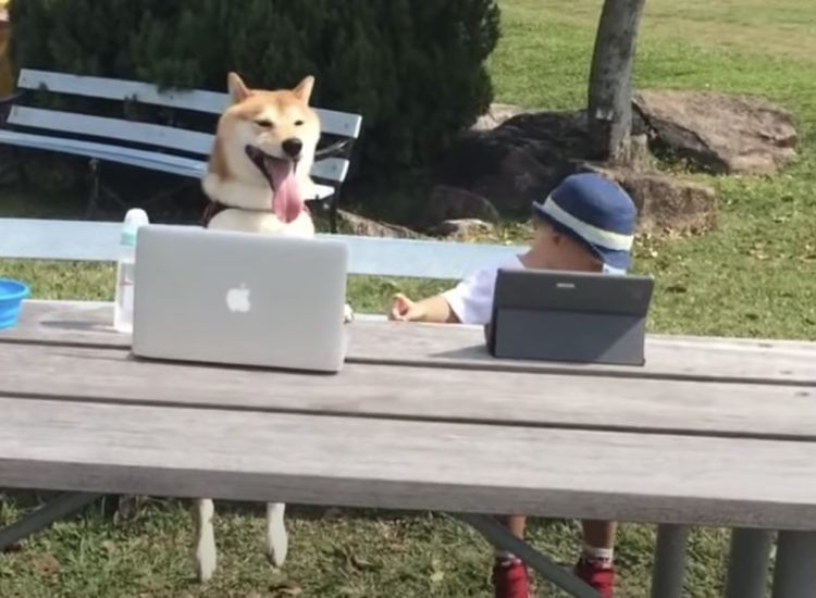 天気がいい日に公園までお散歩! 周りをふと見渡してみると... ベンチに座っている子供と柴犬さん。 なんとふたりともテーブルに パソコンを広げてお仕事中!? 公園で犬がMac使っていたら 思わず二度見してしまいますね。 一体どんなお仕事をしているんだ... -
