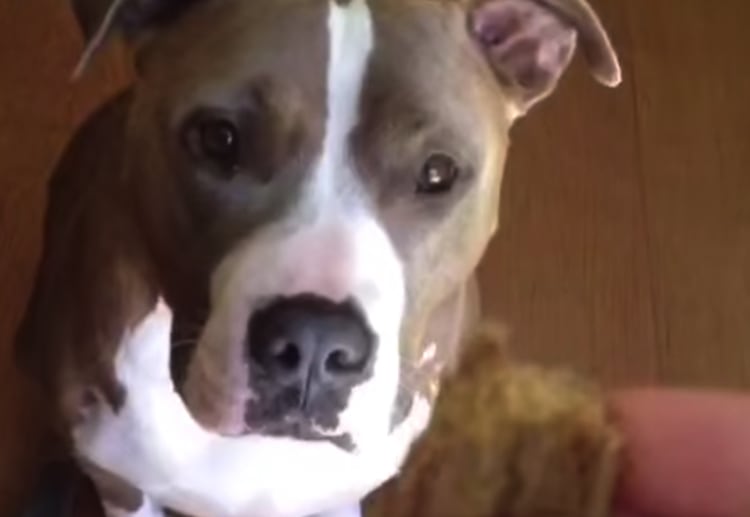 「え、消えちゃった!?」おでこに乗ったオヤツに気づかないワンコ。