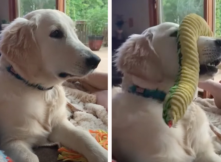 おやつだと思ったら、あれ?!野菜には騙されない犬。