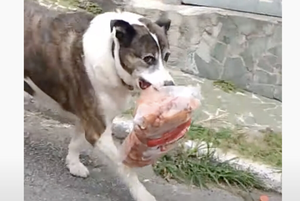 ゲットしてきたよ〜! 散歩帰りにソーセージを運んできた犬。