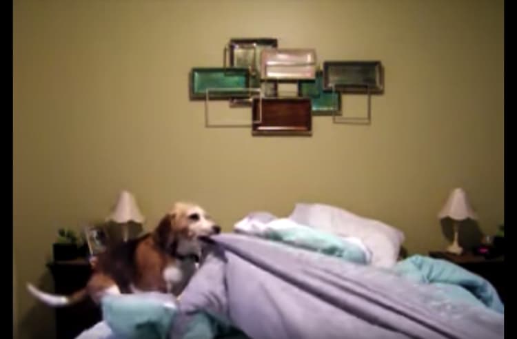 睡眠の質は大事です!こだわりのベッドメイキングをする犬。